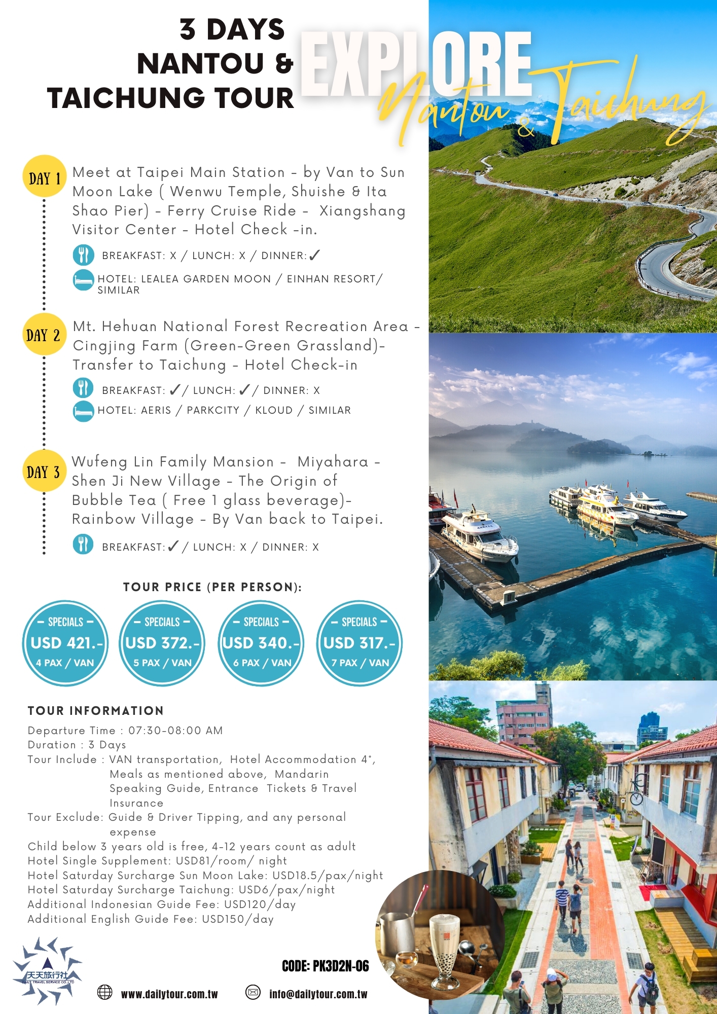*Sun Moon Lake Hotel Saturday Surcharge : USD18.5/per night/per pax ; Taichung Hotel Saturday Surcharge : USD6/per night/per pax